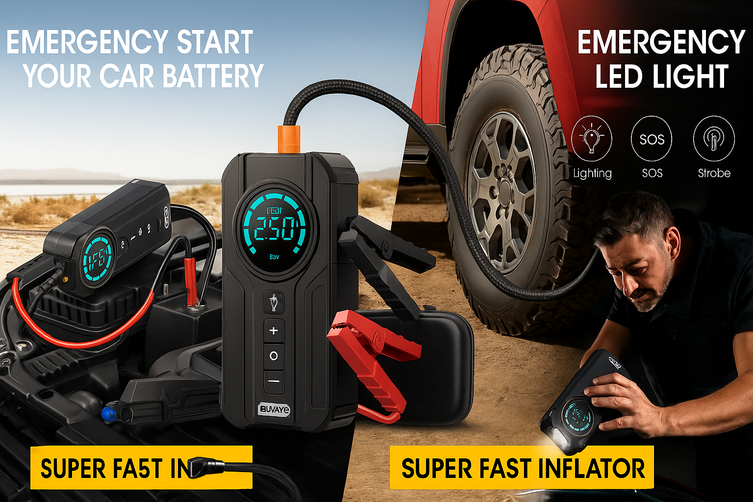 4-in-1 Car Jump Starter & Tire Inflator – Portable Battery Booster and Air Compressor for Cars