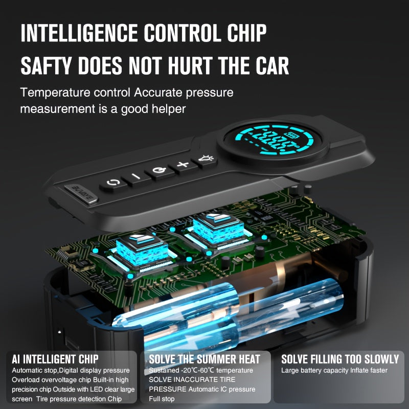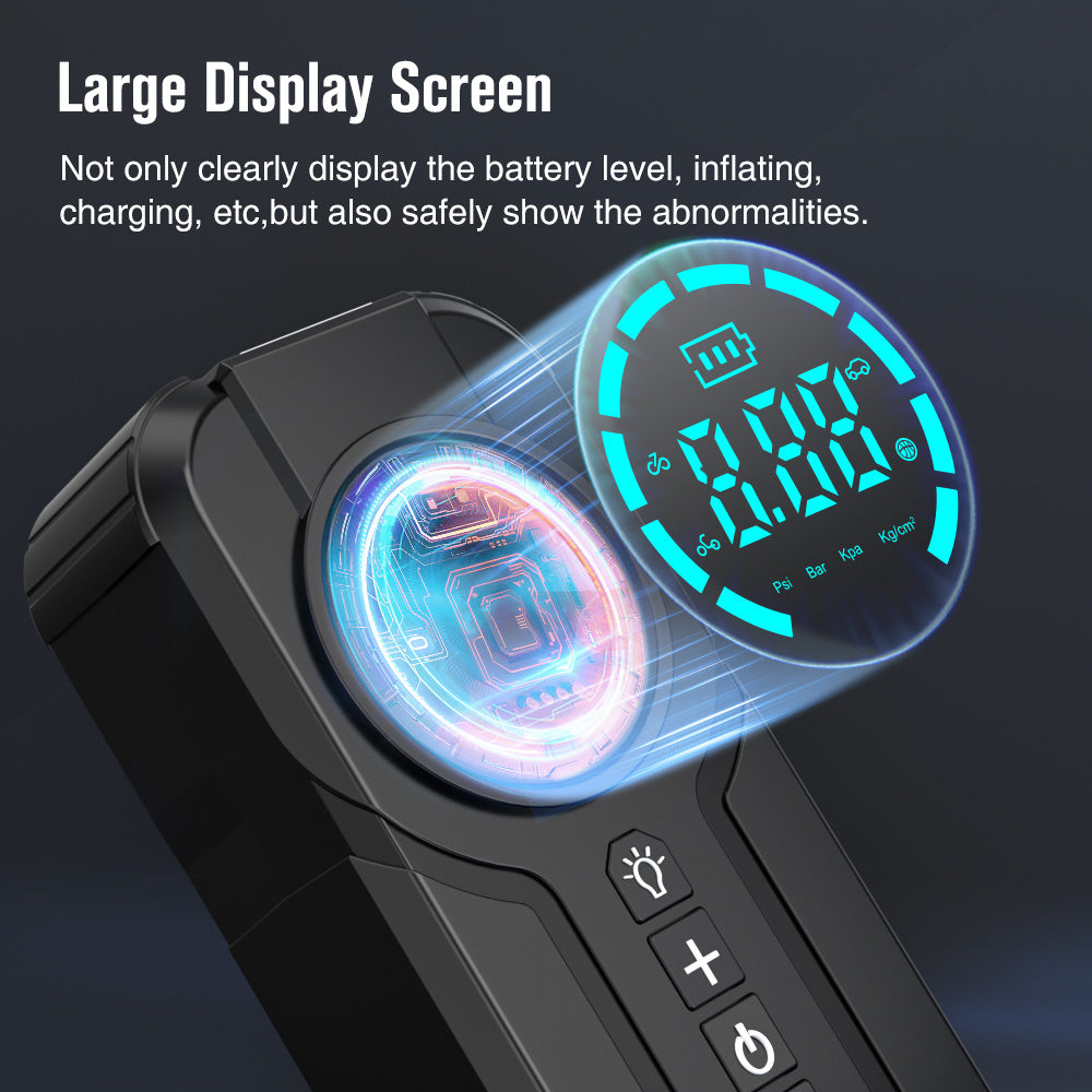 Turbocharged air pump with up to 150 PSI and precise pressure sensor. Supports tire pressure detection, preset pressure, automatic stop, and unit switching (PSI / BAR / KPA). -